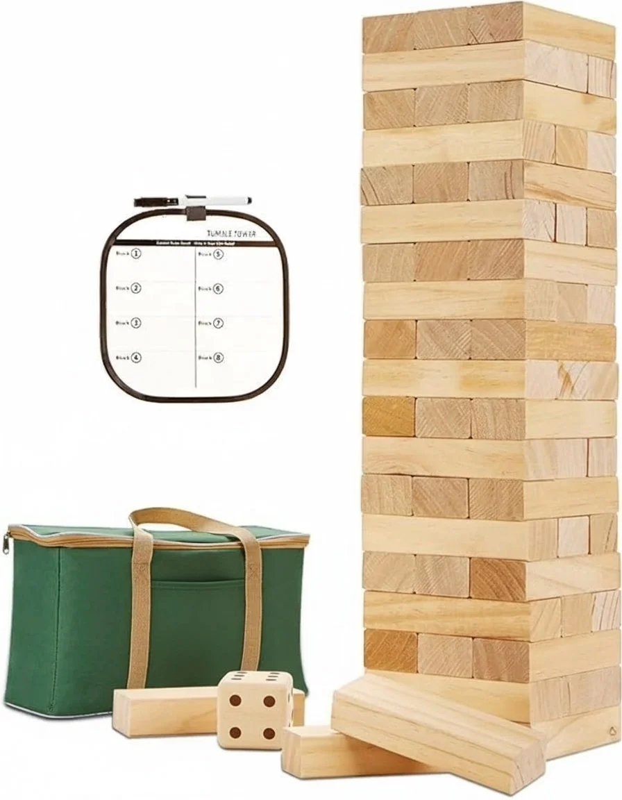 Includes 60 solid wood blocks, dice, scoreboard, marker, and carry bag
